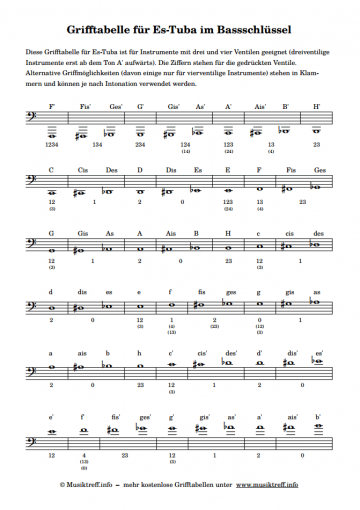 Hier gibt es eine Grifftabelle für Es-Tuba im Bassschlüssel zum kostenlosen Download als PDF-Datei. Noten für Es-Tuba werden entweder, wie bei der hier herunterladbaren Datei, nichttransponierend im Bassschlüssel, d. h. klingend „in C“ notiert, oder transponiert im Violinschlüssel.