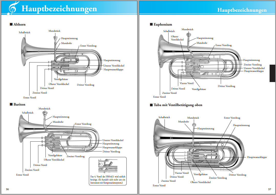 Neben den Grifftabellen wird in diesem Handbuch Schritt für Schritt das richtige Zusammensetzen und Zerlegen tiefer Blechblasinstrumente erläutert und es gibt Tipps für die Instrumentenpflege und eine Erläuterung der einzelnen Instrumentenkomponenten. Diese Bedienungsanleitung liegt allen tiefen Yamaha-Blechblasinstrumenten in gedruckter Form bei, hier kann sie kostenlos als PDF-Datei heruntergeladen werden.